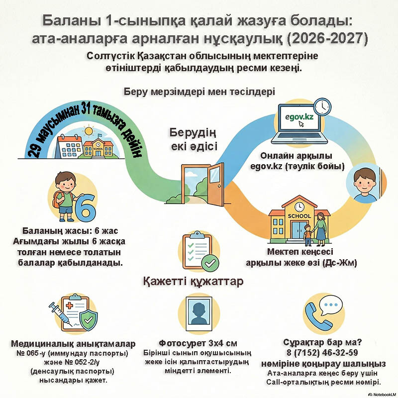 Солтүстік Қазақстан облысында бірінші сыныпқа қабылдау 29 маусым мен 31 тамыз аралығында өтеді. Баланың құжаттарын egov.kz, электрондық үкіметтің веб-порталында және көрсетілетін қызметті берушінің кеңсесі арқылы тапсыруға болады.