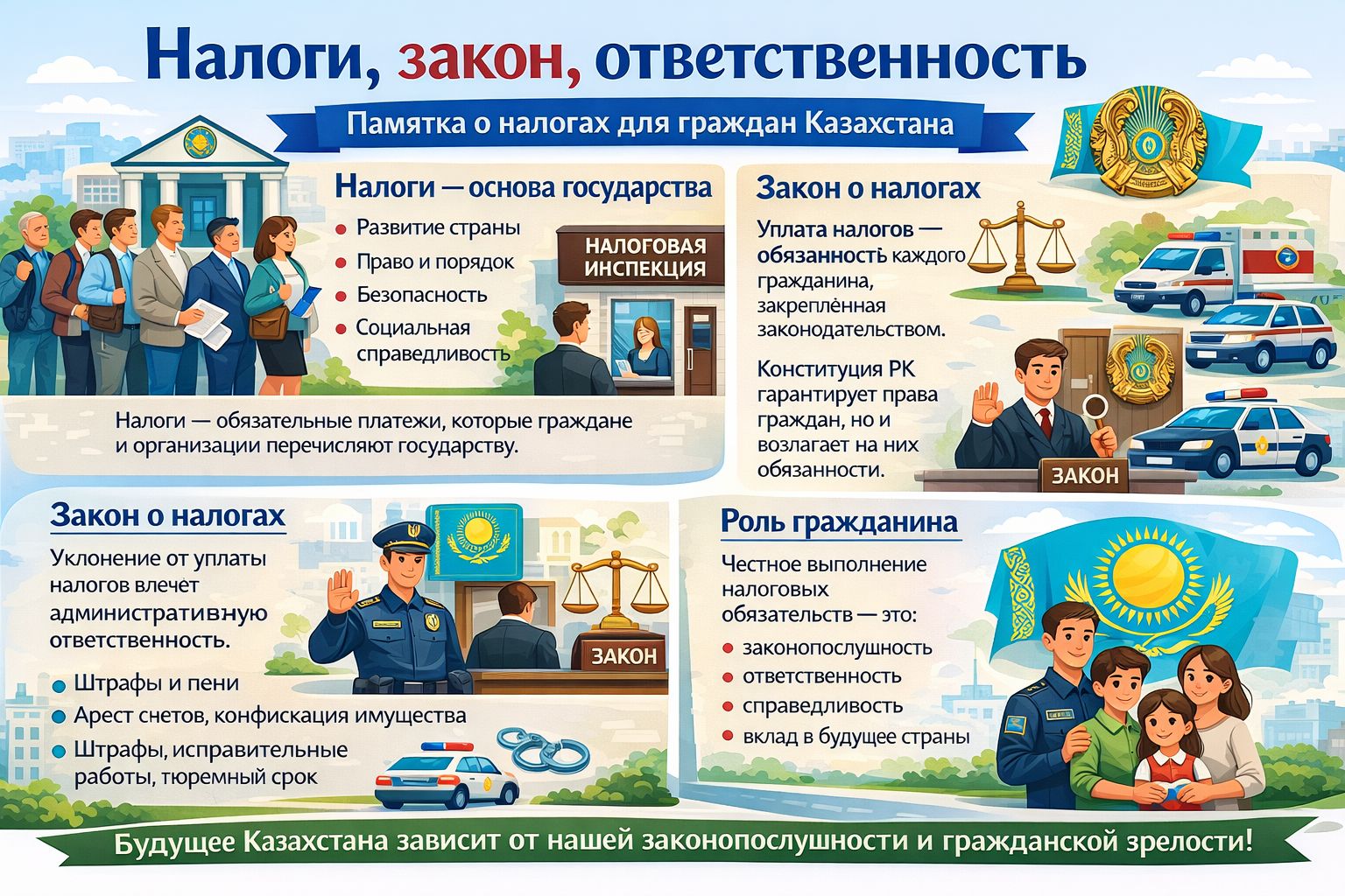 Уважаемые родители! В рамках проведения месячника "Закон и порядок" обращаем ваше внимание на ответственность в сфере налогообложения. Уведомляем вас о необходимости соблюдения налогового законодательства Республики Казахстан, своевременного декларирования и уплаты налогов с получаемых доходов, о формировании у детей уважительного отношения к закону и правопорядку. Налоги являются важной составляющей социального развития государства и обеспечивают финансирование образования, медицины и социальной сферы. Просим Вас с ответственностью отнестись к выполнению своих гражданских обязанностей и быть личным примером законопослушного поведения для детей. Соблюдение закона - залог стабильности и благополучия общества!
